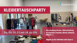 Donnerstag, 09.10.: Kleidertauschparty um 18.30 Uhr – gut erhaltene Herbst- und Winterkleidung kann an der Infotheke abgegeben werden – herzliche Einladung, komm vorbei und bringe deine Freundin mit.