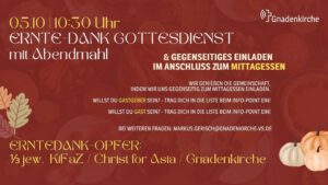 Sonntag, 05.10.: Erntedankgottesdienst um 10.30 Uhr mit gegenseitigem Einladen zum Mittagessen – Liste für Gäste und Gastgeber ist an der Infotheke –